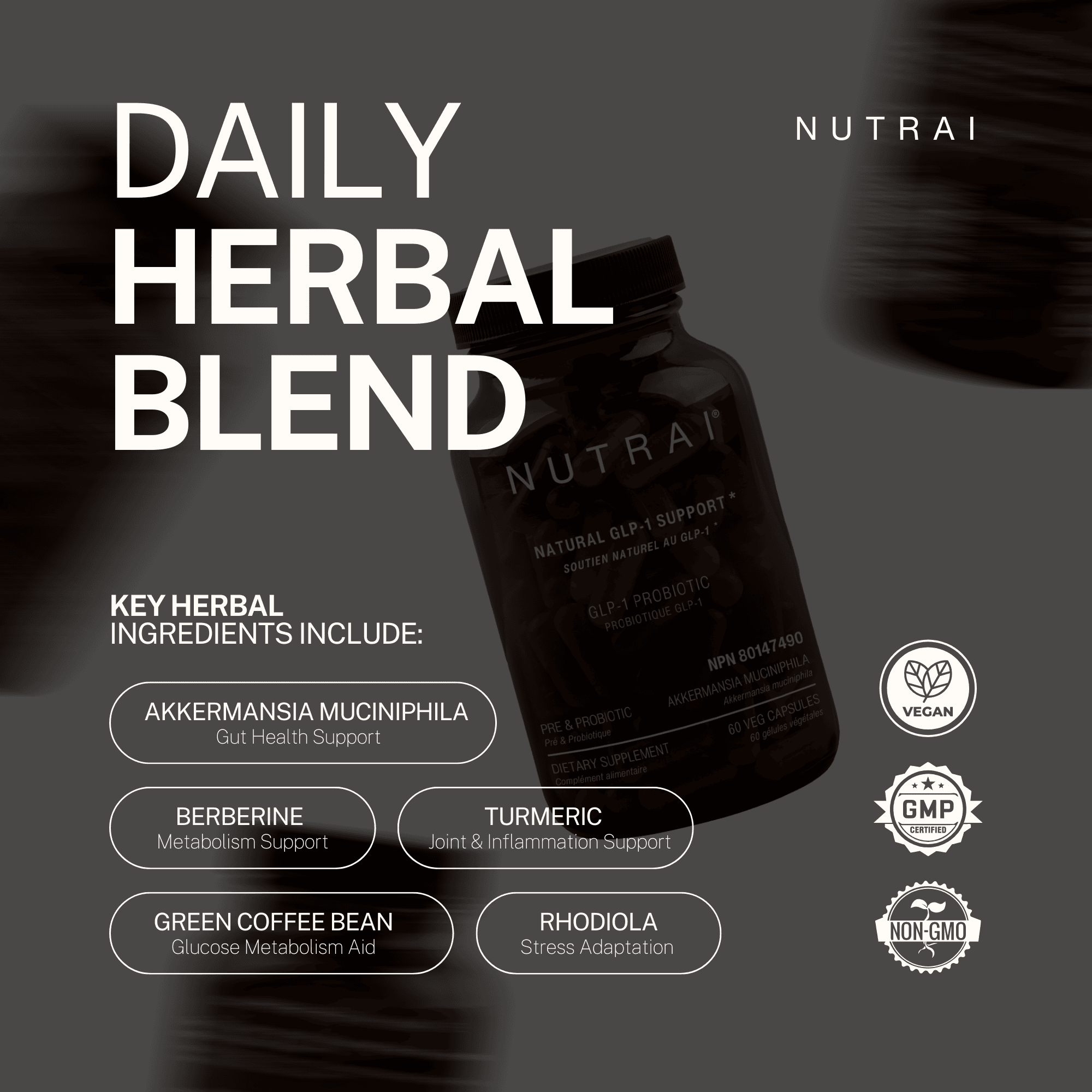 Our formula combines science-backed ingredients like Akkermansia muciniphila for gut lining integrity, Berberine for blood sugar support, and Green Coffee Bean to boost metabolism. Whether you are looking to reduce bloating, improve nutrient absorption, or support your immune system, Nutrai provides a gentle yet effective solution. Made with a "Gentle & Clean" philosophy, it is 100% vegan, Non-GMO, and free from artificial additives.