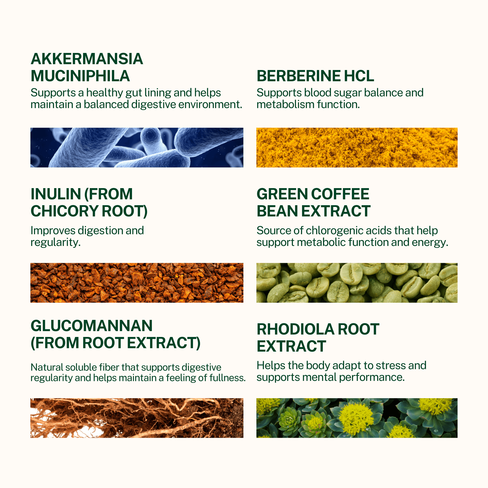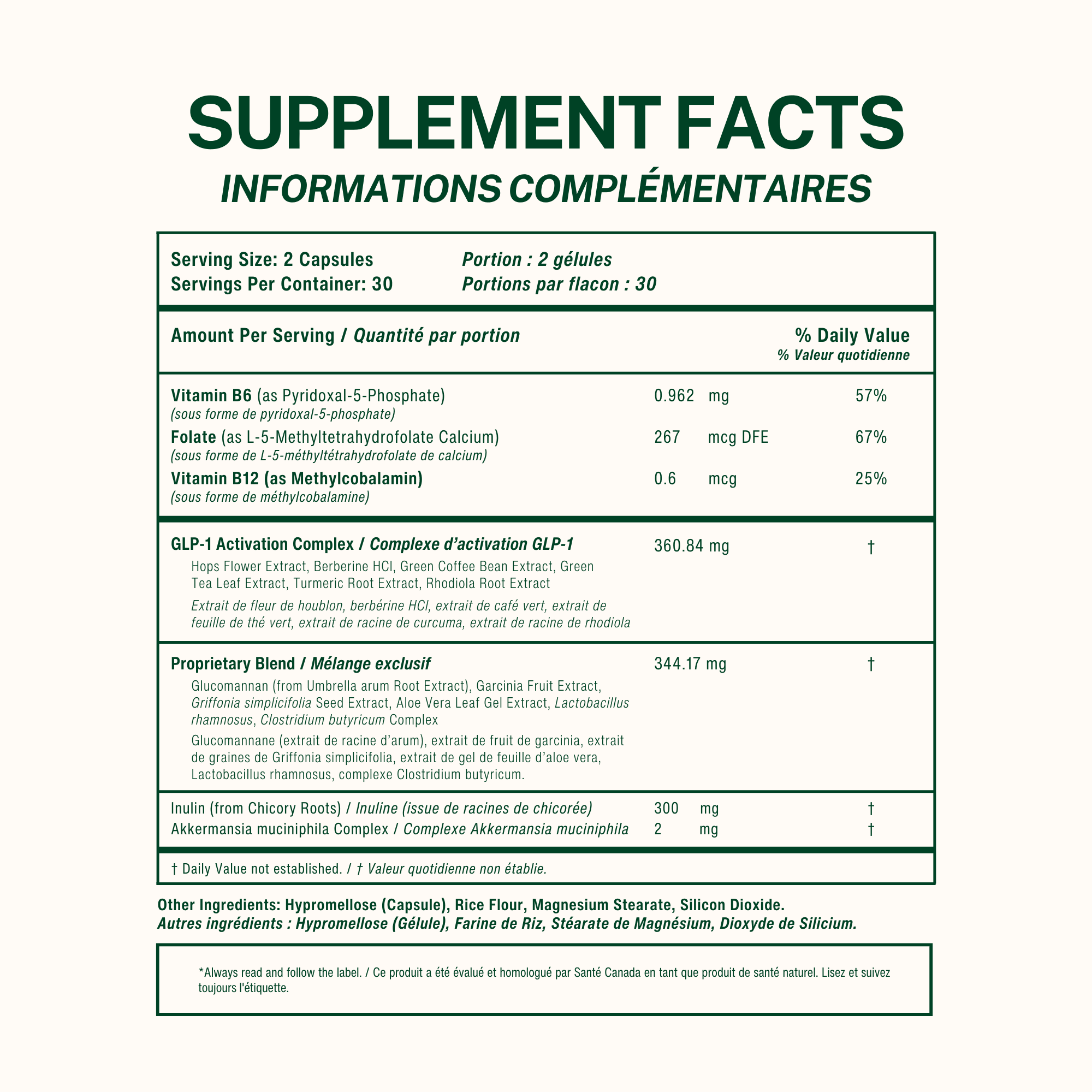 Hops Flower Extract, Berberine HCl, Green Coffee Bean Extract, Green Tea Leaf Extract, Turmeric Root Extract, Rhodiola Root Extract, Glucomannan (from Umbrella arum Root Extract), Garcinia Fruit Extract, Griffonia simplicifolia Seed Extract, Aloe Vera Leaf Gel Extract, Lactobacillus rhamnosus, Clostridium butyricum Complex, Inulin (from Chicory Roots), Hypromellose (Capsule), Rice Flour, Magnesium Stearate, Silicon Dioxide.