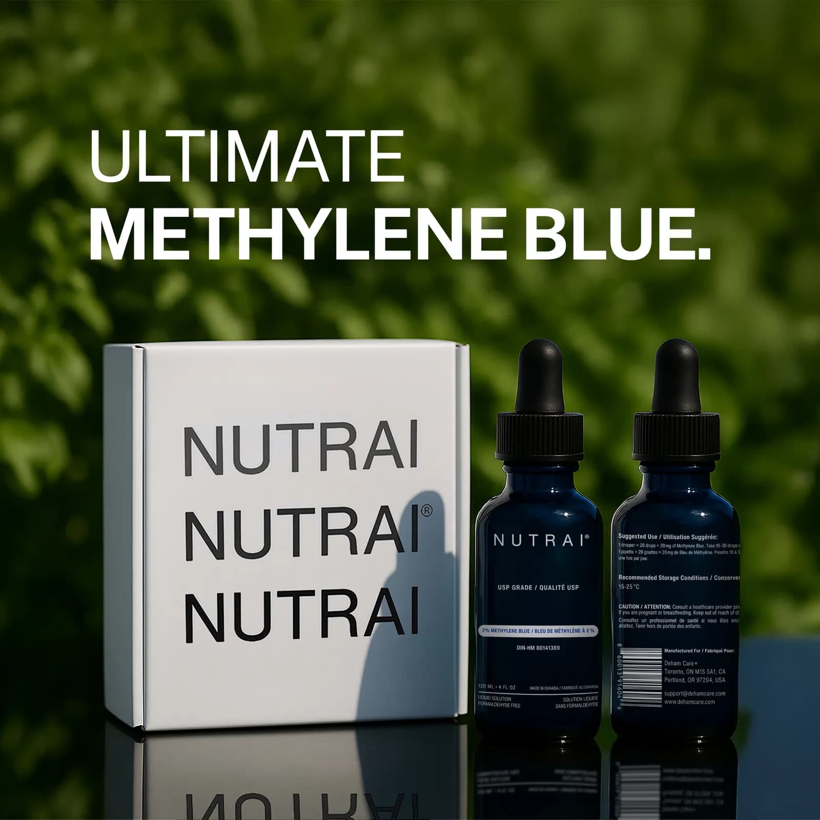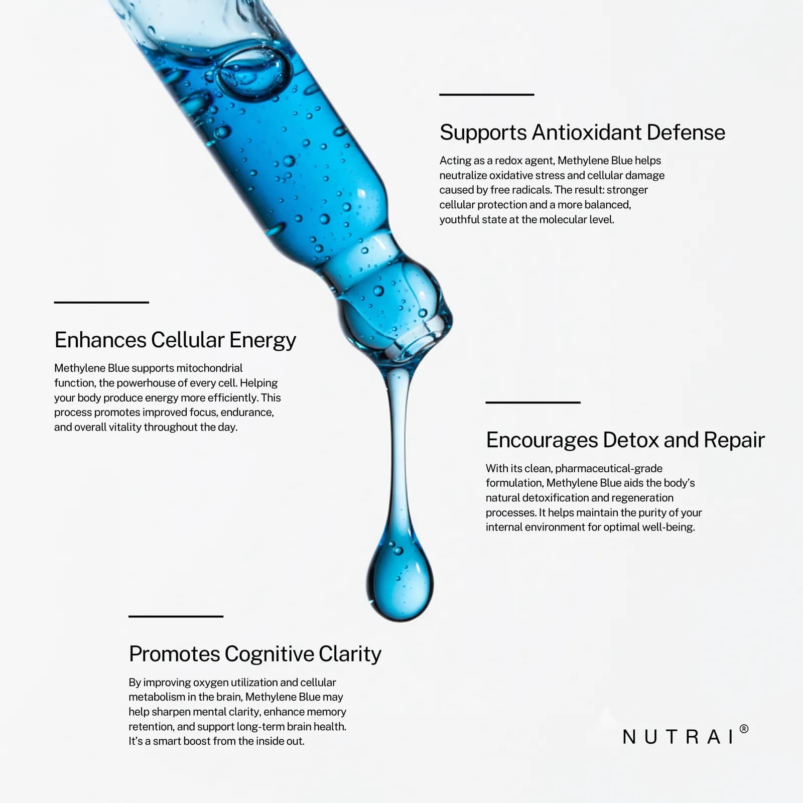 Nutrai offers a high-purity, 2% Methylene Blue solution meticulously crafted for those seeking peak cognitive and cellular performance. This USP-grade formula undergoes rigorous third-party testing to ensure it is free from heavy metals, formaldehyde, and microbial contaminants, providing a clean and effective supplement you can trust.